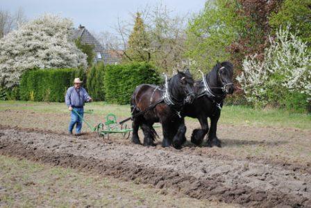 des Festsonntags am 14.09.14. Mit seinen beiden Pferden Jack und Joe hat er schon einmal den Acker gepflügt, auf dem er am 14.09.14 Auszüge der Landwirtschaft früher präsentieren wird. Die Pferde gehören zur Niederländischen Kaltblutrasse und sind sechs und vier Jahre alt.